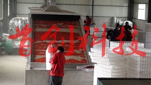 枸杞通過(guò)枸杞清洗破蠟機(jī),然后自動(dòng)裝盤機(jī)分裝入烘盤,然后用推車將送入烘干箱內(nèi),枸杞在烘干箱的通過(guò)熱風(fēng)循環(huán)在烘室內(nèi)靜態(tài)烘干,...